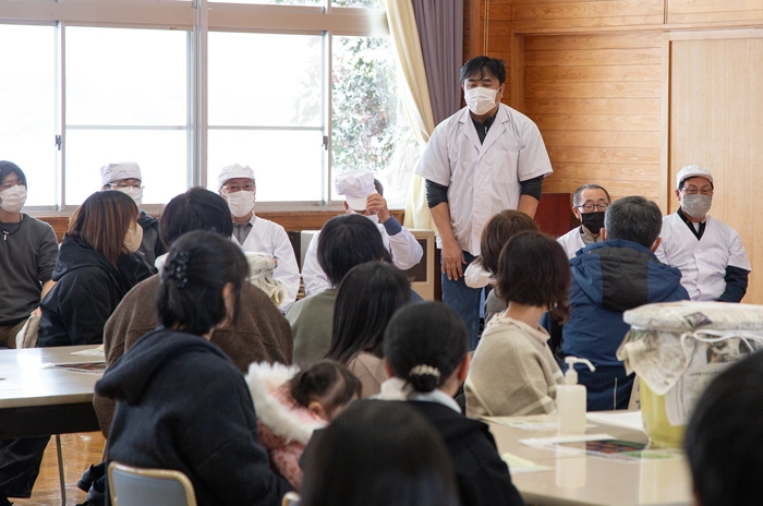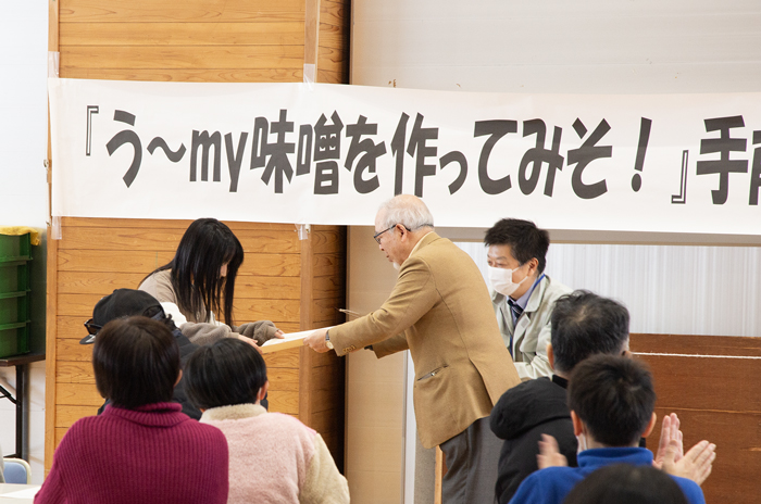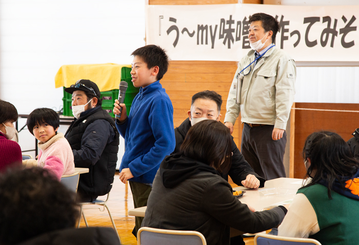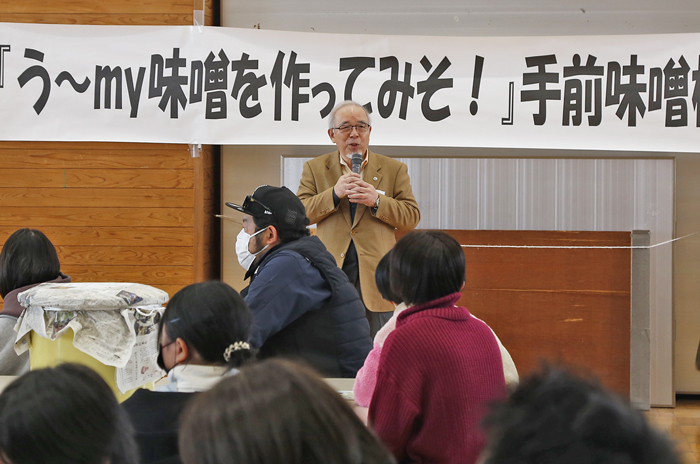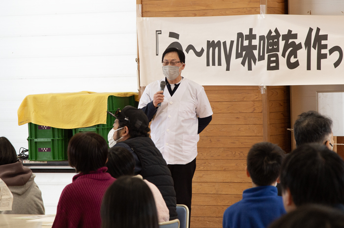 続いてサポートしてくれる市内のこうじ屋さんが紹介されました。皆さんは、大豆から作った味噌の管理までのプログラムを通して、サポートしていただいています。