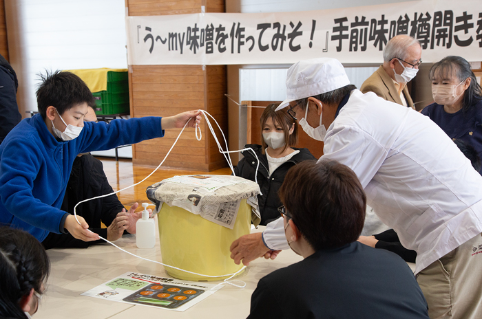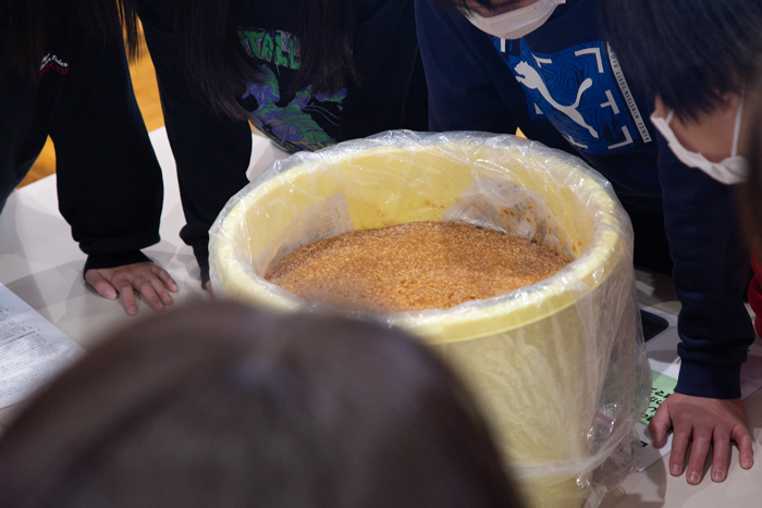 この味噌は、6月25日に仕込んだもので、6年生が大豆をテーマに作付けから収穫、大豆を使った味噌作り教室や発酵食品について学ぶプログラムの一環です。